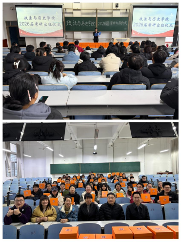 12月15日下午,太阳集团与历史学院在思贤楼119教室举行2026届考研出征仪式。学院党政领导、专业课教师代表、毕业班班主任及全体考研学子齐聚一堂,为即将奔赴考场的学子加油鼓劲。